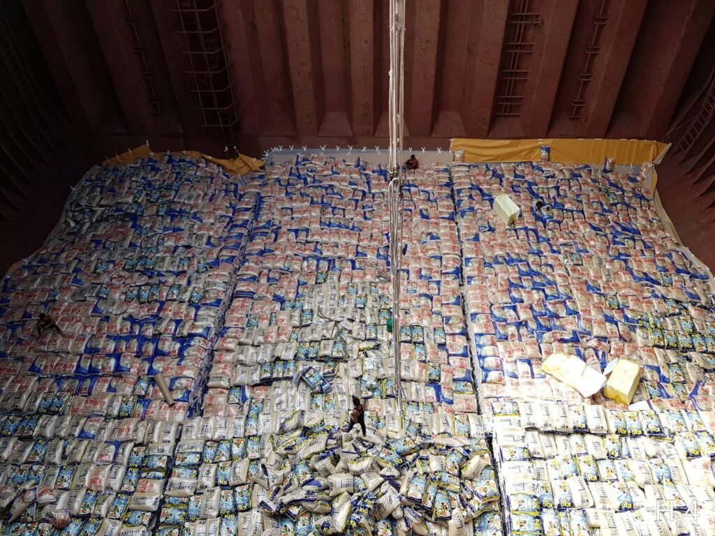 - Bags (usually 25kg or 50kg) are manually or mechanically stacked in rows inside the container.